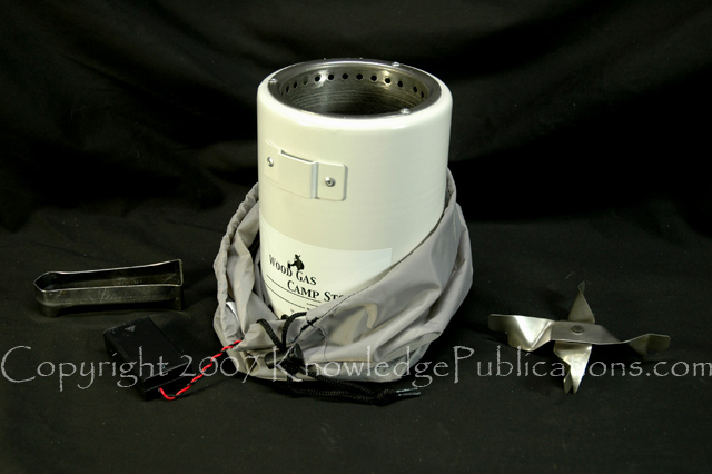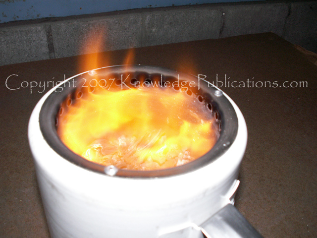 The books Hydrogen Gas Generator for Vehicles and Engines, Volumes 1 to 5 deal explicitly with making hydrogen gas from organic material to run an engine or a car. This stove is EXACTLY one of those generators. It was developed by Tom Reed, who wrote the book that is Volume 4 in the Hydrogen Gas Generator series. The Wood Gas stove is a working model for you to follow and use in your development. The Wood Gas stove is actually an "Upside Down Up-Draft Gassier." It is actually making a hydrogen dominated combustible gas from the wood or biomass in the stove and it is then feeding that gas BACK INTO the stove for the purpose of heat and for making more gas. With what you make in Volumes 1 to 5, you are not feeding the gas back into the stove (unless you are running a pure steam reformation process), but the gas you see coming out of the round holes (jets) at the top of the stove is what you are feeding into your engine, furnace, or melting furnace, etc... This is a working model that helps you see what the output of your larger one should do and, on top of that, this is ONE GREAT little stove. At 10,000 BTU's of rating, it’s much larger than most camp stoves that are normally 3,000 or 4,000 BTUs. Plus, your fuel is all around you. Wood chips, twigs, cut pieces of branches, pine cones, acorns, tree nuts, etc. ALL work incredibly well. -Steven Harris, KnowledgePublications.com