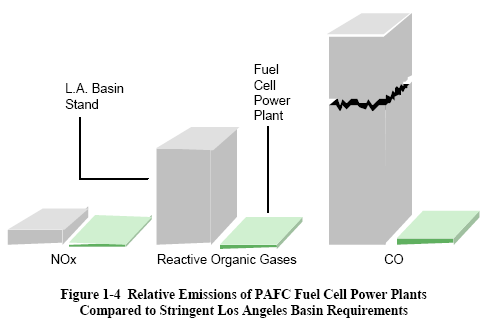 The interest in terrestrial applications of fuel cells is driven primarily by their potential for high efficiency and very low environmental impact (virtually no acid gas or solid emissions). Efficiencies of present fuel cell plants are in the range of 30 to 55 percent based on the lower heating value (LHV) of the fuel. Hybrid fuel cell/reheat gas turbine cycles that offer efficiencies greater than 70 percent LHV, using demonstrated cell performance, have been proposed. Figure 1-4 illustrates demonstrated low emissions of installed PAFC units compared to the Los Angeles Basin (South Coast Air Quality Management District) requirements, the strictest requirements in the U. S. Measured emissions from the PAFC unit are < 1 ppm of NOX, 4 ppm of CO, and <1 ppm of reactive organic gases (non-methane) (5). In addition, fuel cells operate at a constant temperature, and the heat from the electrochemical reaction is available for cogeneration applications. Table summarizes the impact of the major constituents within fuel gases on the various fuel cells. The reader is referred to Sections 3 through 7 for detail on trace contaminants.