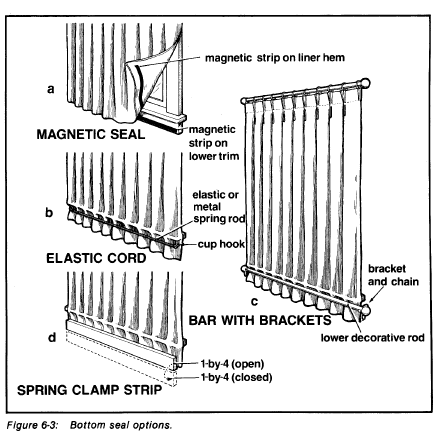 Bottom Seals - Because air, cooled by a window, tends to fall to the floor, the bottom seal on a curtain is the most important one. A versatile bottom seal for draperies is very difficult to design. No single method suits all window situations. A variety of bottom seal options are described below: