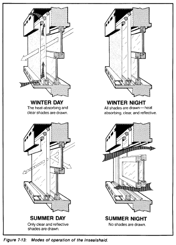 Insealshaid—This is a very clever shade unit with three separate shades for windows and glass patio doors. It is made by Arc-Tic-Seal Systems, Inc., P.O. Box 428, Butler, WI 53007. The unit comes complete with a reflective film shade on the window side, a clear film shade in the middle, and a black, heat-absorbing film shade on the room side. The four modes of seasonal day-night operation are shown in Figure 7-13. The shade housing has vents into the room that open automatically when bimetallic strips respond to temperatures behind the black shade that reach 82°F. or more.