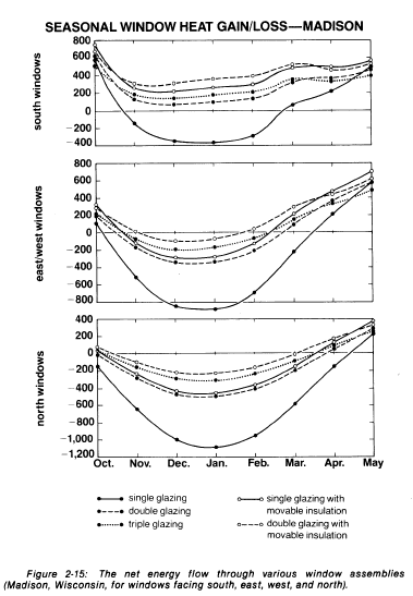 East-facing or west-facing windows all lose heat in Madison during December and January, although with double glazing and R-5 night insulation, these losses are small. East and west windows are most beneficial during the springtime when the days are longer and much more sun can shine on them during early morning and late afternoon.