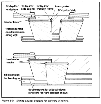 Panels that slide on hardwood rails can also be made for ordinary windows. Because they are smaller, and lighter, and are raised off the floor, the panels are farther away from dirt sources which can jam them. Figure 8-9'(modified for a window) shows how such a sliding shutter can be added to an existing window. Note how the edge seals are made to butt with a foam gasket. For wider windows the track can be extended to both sides of the window with a panel moving to each side. On a very large window a double track can be used so that the edges of the outer pair of shutters can interlock with the inner pair.