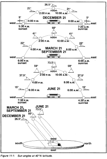 Before applying any type of outside shading, an examination of the hourly location of the sun during each season is necessary. Figure 11-1 shows the sun path for a middle (40-degree) latitude location (Philadelphia, Pennsylvania; Columbus, Ohio; Denver, Colorado) on December 21, March 21, September 21, and June 21. The sun rises at 7:30 A.M. on December 21, reaches an altitude of 21 degrees at 10:00 A.M., 26.5 degrees at noon, back to 21 degrees at 2:00 P.M., and sets at 5:30 P.M. On March 21 and also September 21 the sun rises at 6:00 A.M., reaches an altitude of 50 degrees at noon, and sets at 6:00 P.M. On June 21, the sun rises at 4:30 A.M., reaches an altitude of 37.5 degrees by 8:00 A.m., 59 degrees by 10:00 A.M., 73.5 degrees at noon, 59 degrees at 2:00 P.M., 37.5 degrees at 4:00 P.M., and sets at 7:30 P.M.