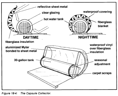 The fiberglass blanket in this design is attached to a curved sheet of galvanized steel that reflects sunlight onto the tank (see Figure 18-4). Aluminized Mylar is glued to this galvanized sheet to increase its reflective properties. Hinged 2-by-4s at each end of the tank hold the reflector in position and guide it as it closes. These arms are shifted seasonally to adjust the tilt of the reflector to winter and summer sun angles. A waterproof vinyl fabric covers the insulation on the outside. Carpet scraps are glued along each end and the bottom of the tank to make a tight seal when the cover is closed.