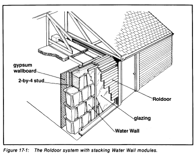 A cutaway view of a Water Wall Modular system, called the Roldoor, is illustrated in Figure 17-1. Standard gypsum wallboard is used inside the water wall to give a simple, clean, and traditional appearance to the interior, and also to slow down the rate of heat transfer into the living space. This gypsum board has about the same resistance to heat flow as the glass on the outside. However, the temperature difference between the water wall and outside is much greater than between the water wall and inside. With the insulating effect on the interior gypsum board included in this design, the night insulation provided by the Roldoor system becomes very important. Without the Roldoor system, most of the heat stored in the water wall would exit through the glass to the outside instead of gradually entering the interior.