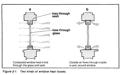 Infiltration losses are difficult to measure precisely, yet they can be very significant. A single-glazed window that is loose and poorly fitted can lose twice as much heat through the air cracks (or through infiltration) than through the glass area itself (or through conduction) (see Figures 2-1 a and 2-1b). The amount of heat lost by air leakage depends not only on the size of the cracks around the sash and frame, but also on the outside wind speed and direction. Table AIV-1 in Appendix IV shows the number of cubic feet of air flow per linear foot of crack for several different types of sash treatments and wind speeds.