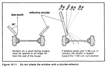Side-hinged shutters can serve as reflectors to boost solar heat gains on winter days. However, they are only useful a couple of hours each day because of constant change in the orientation of the sun. The additional solar gain from reflective side-hinged shutters will be more than nullified if they shade a window during the main part of the day. These shutters must never block direct winter sunlight during the hours of 9:30 A.M. to 2:30 P.M. A clear opening, 45 degrees each side due south (see Figure 10-1 1), will insure against shading the window.