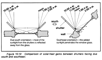 Figure 10-2 shows three types of exterior shutters with hinges either on the bottom, sides, or top. The bottom-hinged shutter opens to a horizontal position on a due-south window. It yields a significant increase in solar heat gained because it reflects" sunlight into the window at an angle that can penetrate the glass during the midday hours of most-intense sun.