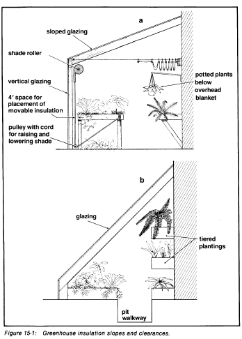 Insulating shades or blankets are often the most effective when they fill an entire wall or ceiling. Large, one-piece thermal barriers are ideal because they minimize the total perimeter of an insulating system and therefore minimize heat loss by air convection. If a long wall shade is used over glazing or in front of tiered plant beds, as shown in Figure 15-1, the beds must be set back not only from the glass, but also from the vertical posts or window mullions to provide clearance for the shade. Several other window insulation systems can be employed successfully but they must be tailored so they can be maneuvered into place without difficulty. Reaching over a 3-foot-wide plant bed is not too difficult, but reaching under one without disturbing the plants beneath it is very difficult. If shades are used, they should be rigged with pulleys and a cord so their daily operation does not require special gymnastics.