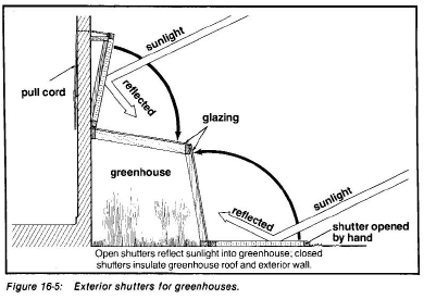 Figure 16-5 illustrates two other exterior, hinged shutters for greenhouses. The top of the greenhouse has a reflector-shutter that reflects low-angle winter sunlight onto plants. Shutters that swing up like this are exposed to heavy winds and require a sturdy frame behind them. A wooden frame can be braced against the second story of a house or posts can be extended through the top of the greenhouse and anchored to a wall or floor at the rear of the greenhouse.