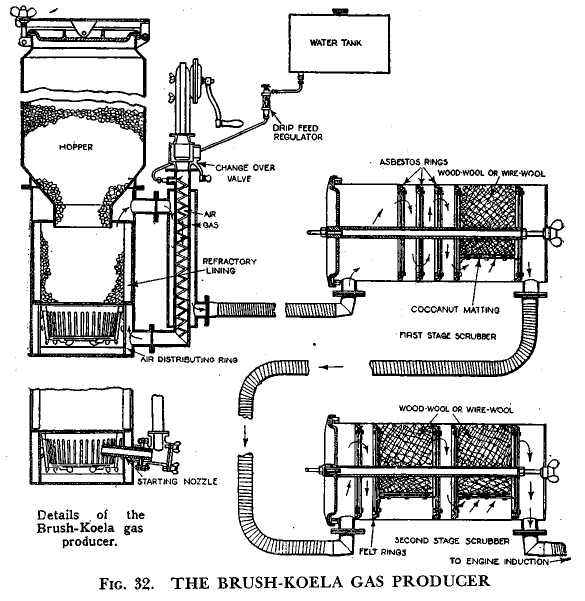 The Brush-Koela gas producer is a plant which consists of a generator and two scrubbers; connected as shown in Fig. 32. The generator is of novel design, in as much as it incorporates both the cross-draught and up-draught principles, the former being used for starting and the latter system brought into operation for regular use. The change from one system to the other is made by a change over valve. Steam is admitted to the fire by being first vaporized by the hot exit gases. The fire grate is of the hanging basket type, and the starting tuyere is composed of carborundum in order to avoid the necessity of providing a water-cooling system which would only receive. occasional use.