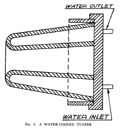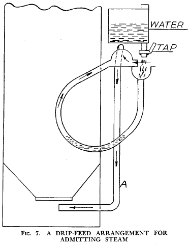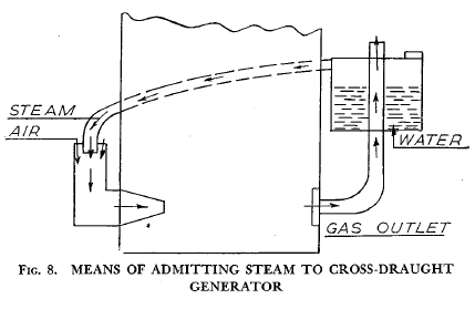 Figs 7 and 8 show two methods of admitting water. The latter cannot be so easily controlled by the operator. The apparatus shown in Fig. 7 is made up of a tank from which water drips into the mouth of a U-tube, one side of which is within the generator. In the lower sections of this tube there will be a pool of water which is being heated by the fire. Steam is given off and passes up the tube into a beehive cone, where it mixes with the incoming air and passes along the tube A, which is let into the generator below the grate. In this manner a mixture of air and steam is supplied to the fire. The system shown in Fig. 8 is an attempt at an automatic means of steam admission, the steam being produced by means of the hot gases from the generator. The advantage of this arrangement is that no steam will be admitted until the fire is hot enough to generate gases that can boil water and so give off steam, which is admitted with air to the tuyere. A more automatic arrangement could be arrived at by fitting a ball and cock valve, which would make allowance for the water boiled away. |