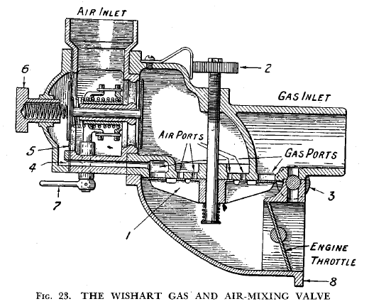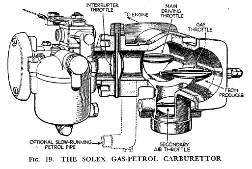 An English firm, Messrs Solex, has produced a very interesting instrument, illustrated in Fig. 19, for use when an engine is running either on petrol or on producer gas, the two separate types of fuel being available at any time.* The carburettor, as Fig. 19 shows, is made up with an extension to its body so arranged that the carburettor can be cut off entirely from this extension by an interrupter throttle. On this happening, the main throttle from the producer is opened, and thereafter the supply of mixture to the engine is controlled by a third throttle in the ordinary manner.
