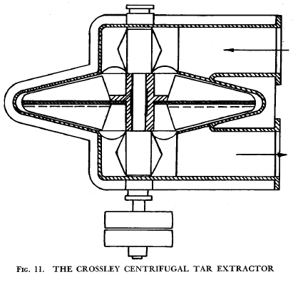 THE CROSSLEY CENTRIFUGAL CLEANERIn the Crossley centrifugal cleaner (see Fig. 11) the gases are directed to the centre of the fan on the inlet side and can pass to the exit only by travelling outwards on the inlet side of the casing, and back to the centre exit to the outlet pipe. Water is made to pass through the exit and, together with the separated tar, is thrown against the casing, to drain finally to the tar sump.