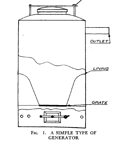 The simplest form of generator is shown in Fig. 1 and consists essentially of a cylindrical or rectangular container to which has been fitted a removable air-tight lid to permit the introduction of fuel which is burned on a grate near the bottom of the generator. A door for the removal of ash and one or more holes for the entry of air are provided below the grate. The gas outlet is placed near the top of the container and connects through the scrubbers to the engine manifold.