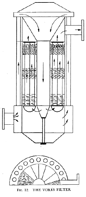 THE VOKES FILTERFig. I2 shows a filter that has been developed by Messrs Vokes Ltd in England. In this filter the gas sucked in by the engine enters a circular chamber at the bottom of the cylindrical filter case. Thence it passes upwards through a ring of tubes, much as water passes along a water-tube boiler, and so reaches the conical mouth of a large chamber. Down this chamber the gas passes, losing many of its impurities in the process, and then turns upwards once more along a series of wedge-shaped passages. In these passages are three sets of brushes looking like the ordinary bristle brushes used for cleaning flues, except that they are all on a common spindle, or rather on three spindles. |